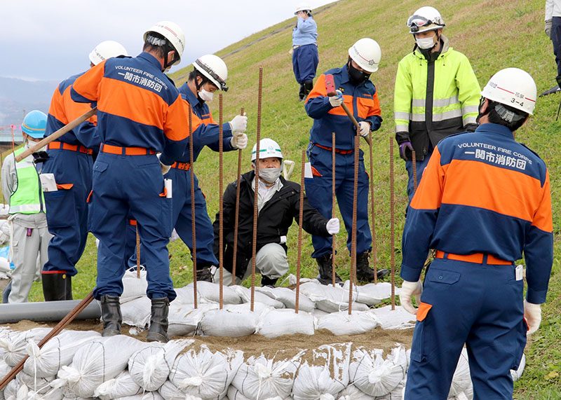 地元の一関市からは市消防本部消防課と一関南消防署、水防団の市消防団花泉地域本部から合わせて9人が参加。佐々木亨花泉地域本部長は「花泉では今年、油島の夏川から水が漏れたため、月の輪工法を行った。増水すると作業しづらく、離れた場所から土のうを運ぶので人手も必要。いざという時のために訓練しておかないと大変になる」と実感を込めて語っていた。