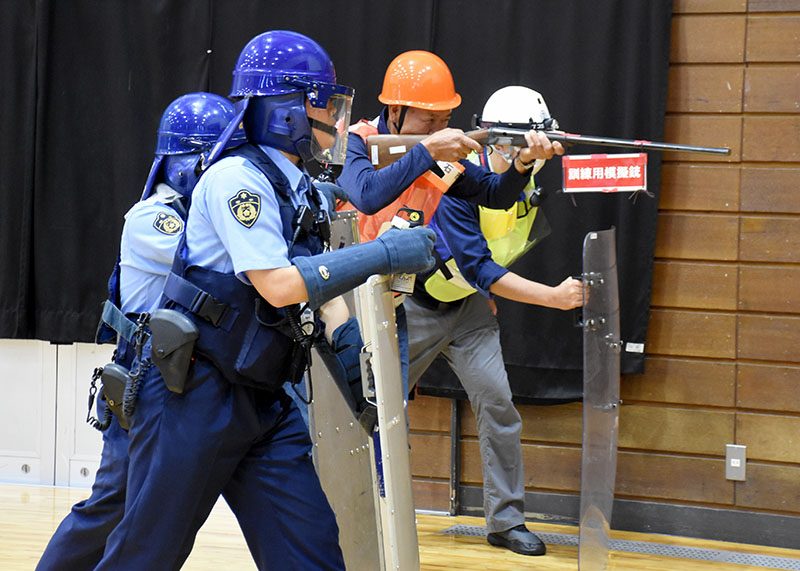 市街地へ出没したクマに発砲する緊急銃猟を可能にした改正鳥獣保護法が9月1日に施行されたのを受け、県は22日、釜石市内でツキノワグマ市街地等対応訓練を初めて行った。県や県警、猟友会が参加し、適切な行動と流れを確認。今年も県内各地でクマによる人的被害が確認されており、関係者が出没の増加が懸念される秋に備えた。