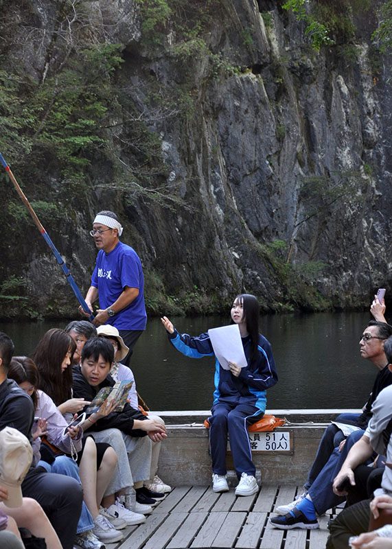 一関市東山町の猊鼻(げいび)渓で舟下りを運航するげいび観光センター(菅原喜哉代表取締役社長)は、地元の高校生を対象に「猊鼻渓舟下り船頭サポーター講座」を開いた。次の世代を担う若者たちに船頭の仕事を知ってもらおうと、猊鼻渓名勝指定100周年事業として企画したもので、高校生が講義や実習を通して日本百景の名勝を国内外に発信する仕事に理解を深めた。