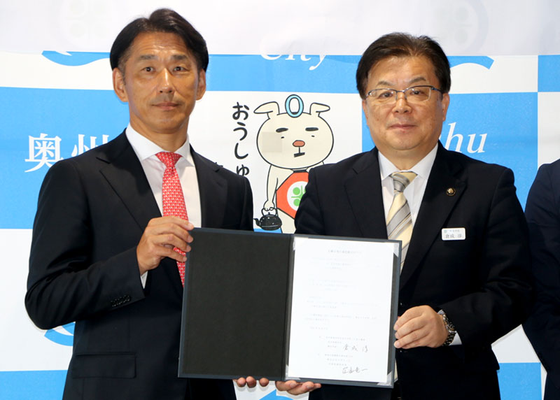 半導体製造装置の制御盤や分電盤の設計・製造を手掛けるクボテック(本社神奈川県秦野市、窪嶋竜一代表取締役社長)は、東北初進出となる工場を奥州市胆沢南都田の広表工業団地に建設する。7日、同市水沢の市役所本庁で立地協定調印式が行われ、倉成淳市長と窪嶋社長が協定書を取り交わした。主要取引先の半導体製造装置大手・東京エレクトロンの東北での生産能力拡大に合わせ生産拠点を整備するもので、2026年春に着工し、27年1月の稼働を目指す。