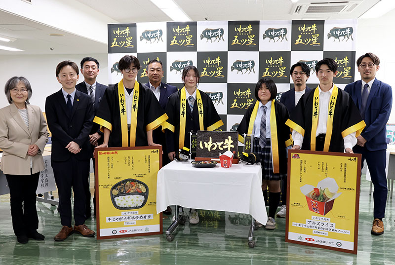 JA全農いわて提供の牛肉と、県立盛岡農業高校の生徒が育てた野菜を使い、盛岡スコーレ高校の生徒がレシピを考案したコラボ弁当が完成した。みちのくジャパンとバスケットボールの岩手ビッグブルズが商品化し、県内で行われるイベントや弁当チェーン店で販売する。関係者は、弁当が県産食材への興味関心や高校生の就農意欲、県産食材の消費拡大につながることを期待している。