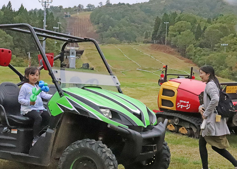 11日はまだ紅葉が進んでおらず、あいにくの雨の中だったが、多くの家族連れが訪れてゴンドラ遊覧や電動モトクロスなどのスポーツ体験、フリーマーケットや芋の子汁販売を楽しんだ。スキー場内を走るバギーへの試乗体験では、バギーにまたがって保護者と共に笑顔で写真撮影する子どももいた。