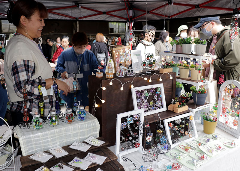 県内外のものづくり作家らが集うイベント「土澤アートクラフトフェア2025秋」(実行委主催)は12日、2日間の日程で花巻市東和町の土沢商店街、萬鉄五郎記念美術館前を会場に始まった。初日はあいにくの雨模様となったものの、クラフトやグルメなど380店余りがずらりと軒を連ね、多くの来場者でにぎわいを見せた。