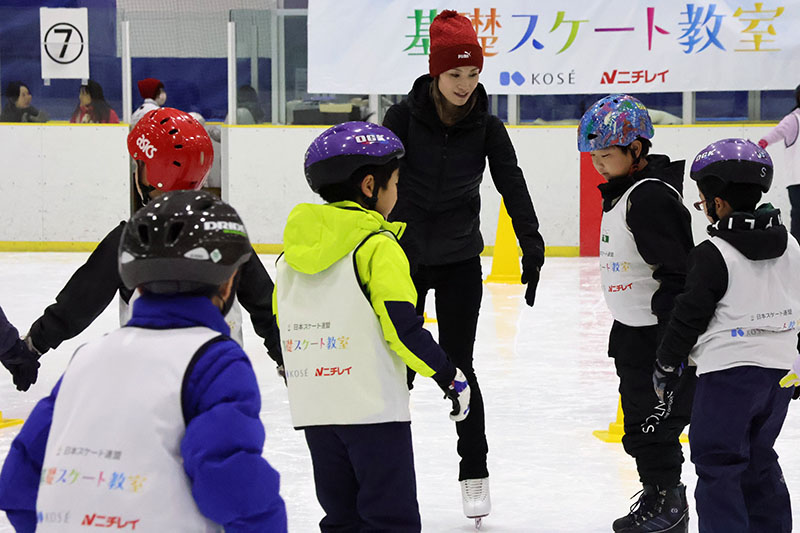 トリノ五輪女子フィギュアスケート金メダリストの荒川静香さんは13日、盛岡市本宮のみちのくコカ・コーラボトリングリンク(市アイスリンク)で基礎スケート教室を開いた。子どもから大人まで初心者にも分かりやすく氷の上に立って歩くこつをアドバイスし、スケートの楽しさを伝えた。