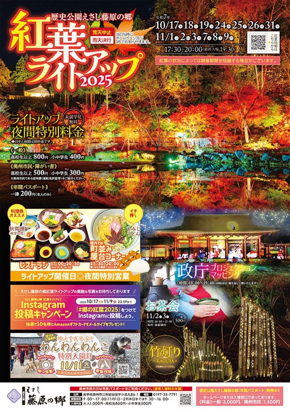 奥州市江刺岩谷堂の歴史公園えさし藤原の郷で、17日から紅葉ライトアップ2025が開かれる。金、土、日曜を中心に11月9日までの13日間、平安建築や庭園など園内を幻想的な光の演出で紅葉を盛り上げる。