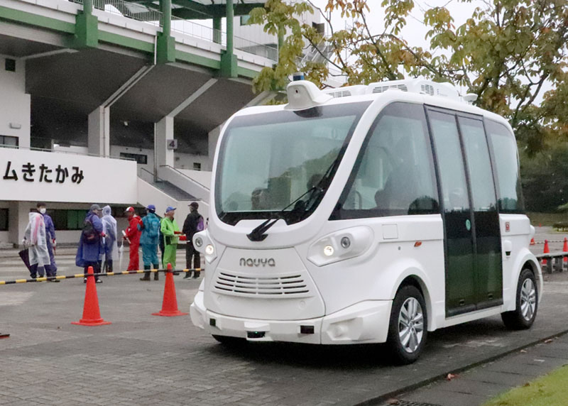 北上市相去町の北上総合運動公園で12日、自動運転バスの試乗会が開かれ、市民らがバスの運転士不足問題解消につながる新たな選択肢を体験した。