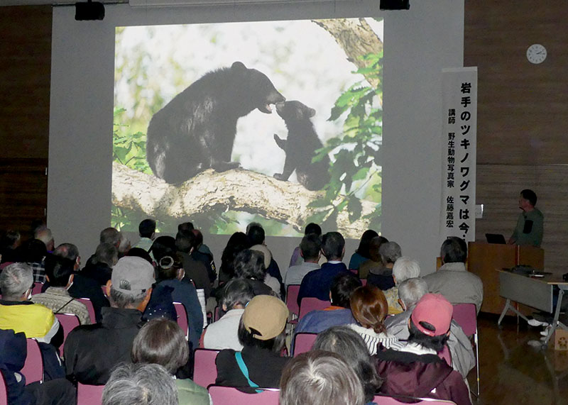 「とうわ野鳥の会」(斎藤秋雄代表)の自然講演会は19日、花巻市東和町の東和コミュニティセンターで開かれた。30年間にわたってツキノワグマを観察し、写真や映像に記録し続けている佐藤嘉宏さん(69)=北上市北鬼柳=が講師を務め、本県のクマの生態や被害に遭わないための対応などを伝えた。