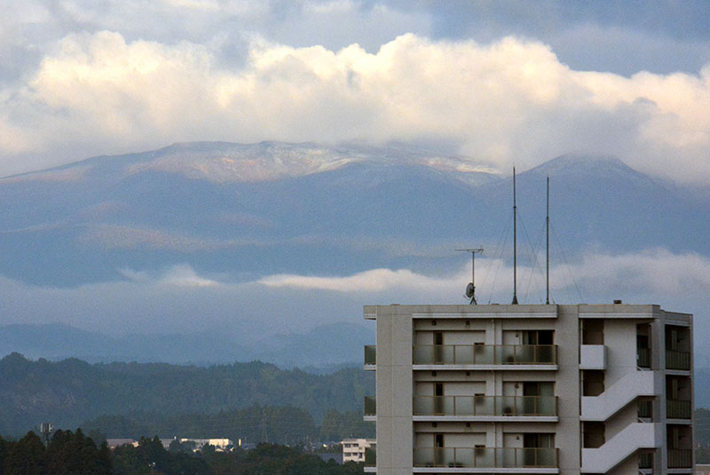 前年より半月早い初冠雪で、8合目にある一関市厳美町の須川高原温泉付近でもみぞれ交じりの冷たい雨が断続的に降った。山頂周辺の山肌がうっすらと白くなった様子は、麓の同市中心部からも雲間から時折望むことができ、道行く市民も足を止めて見入り、近づく冬を感じ取っていた。