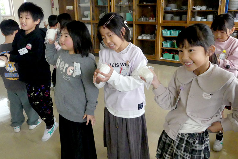 小岩井乳業(雫石町)の職員を講師に招いたバター作りも行われ、一人ずつクリームを入れた容器を上下に一生懸命に振り、出来上がったバターを味わった。