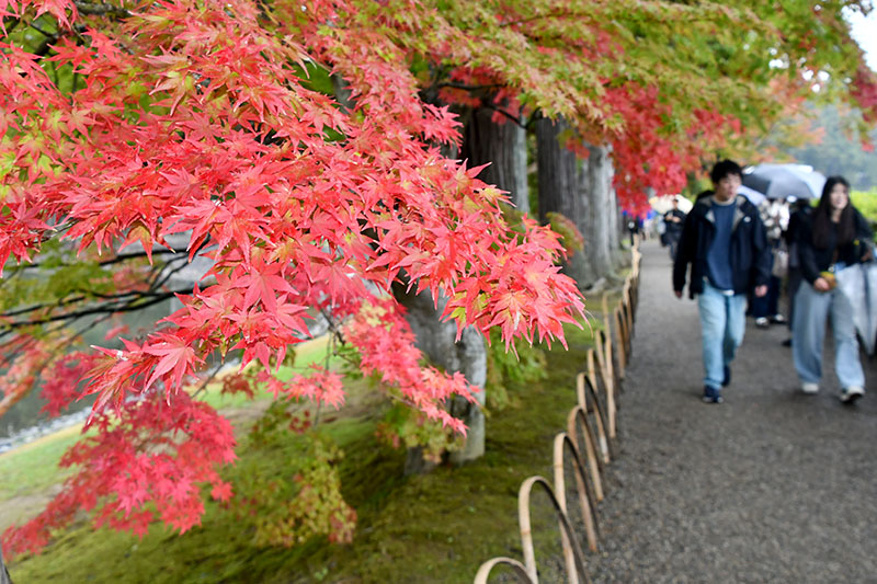 平泉町の毛越寺(藤里明久貫主)で26日、初の紅葉まつりが始まった。あいにくの雨となったものの、境内の木々は色付き始めており、参拝者が多く訪れて秋ならではの浄土庭園の景観を堪能した。11月15日まで。