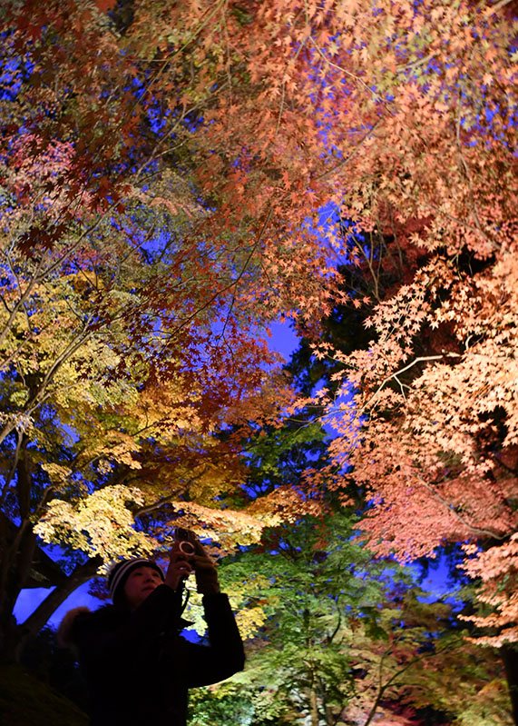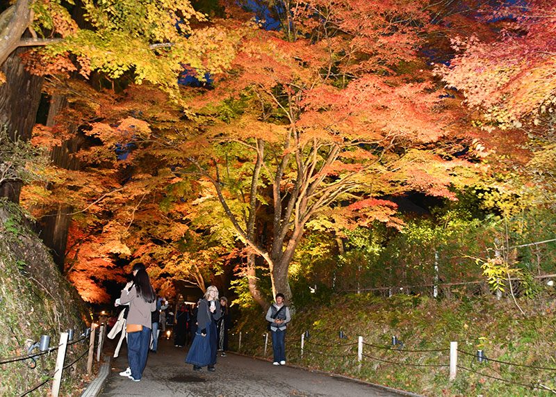 平泉町の中尊寺(奥山元照貫首)の参道照明「紅葉銀河2025」が見頃を迎えた。赤や黄に色付いた葉が夜闇に浮かび上がり、国内外からの参拝客を魅了している。9日まで。