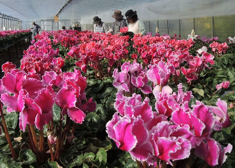 7日は二十四節気の「立冬」。暦の上ではこの日から冬が始まり平地でも初雪の便りが聞かれる頃とされる中、一関市厳美町字高田の農業佐藤修司さん(62)方では、冬を彩る鉢花を代表するシクラメンの販売が始まった。栽培するビニールハウス内は色鮮やかな赤やピンクなどに咲きそろった花で一面覆われている。