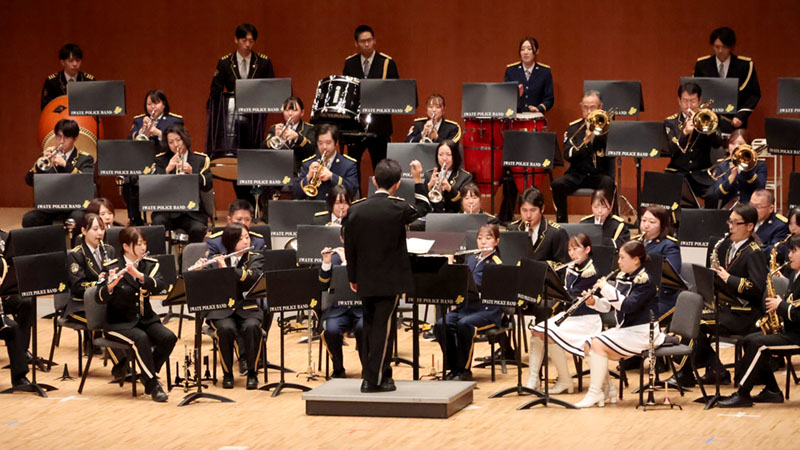 創立60周年を迎えた県警音楽隊の記念演奏会は8日、盛岡市民文化ホール・マリオスで開かれた。1000人を超える聴衆が来場し、県警音楽隊と特別出演の青森、秋田の両県警音楽隊による合奏などを楽しみながら節目を祝った。