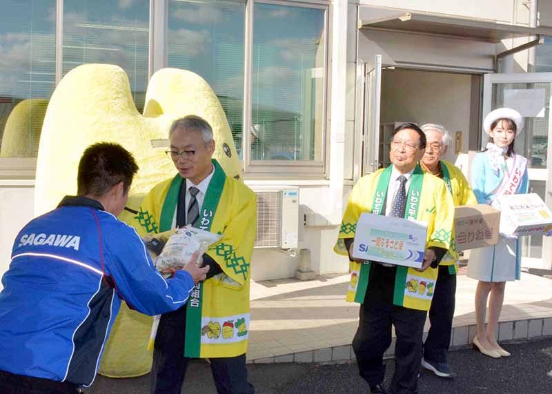 一関市の魅力あふれる味と香りをそろえた一関ふるさと便「冬の便」出発式は12日、同市中里のJAいわて平泉西部営農振興センターで行われ、関係者が新米をはじめとする農畜産物や加工食品を全国各地へ発送した。