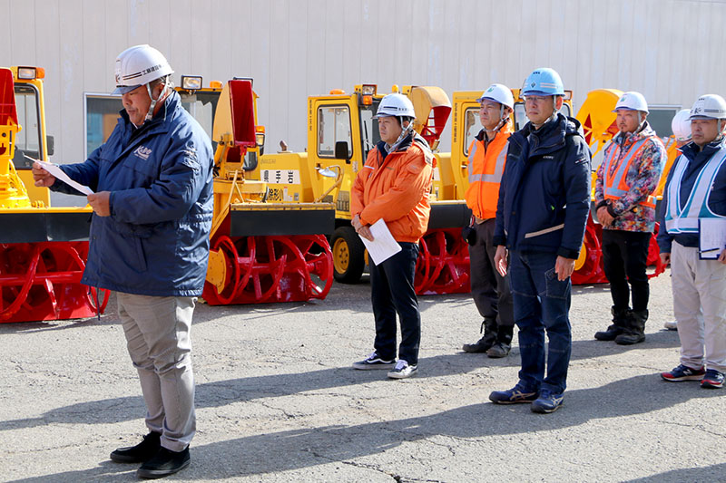 県南広域振興局土木部(佐々木健部長)は13日、除雪機出動式を奥州市水沢字聖天の同部車庫で行った。本格的な降雪を前に、除雪を担う関係者が安全な作業の徹底を誓った。