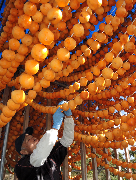 寒さが色濃くなる中、一関市花泉町老松では特産の「おいまつ柿」作りが最盛期。幾重にもつるされた干し柿が寒風にさらされ、日に日に甘みを増している。