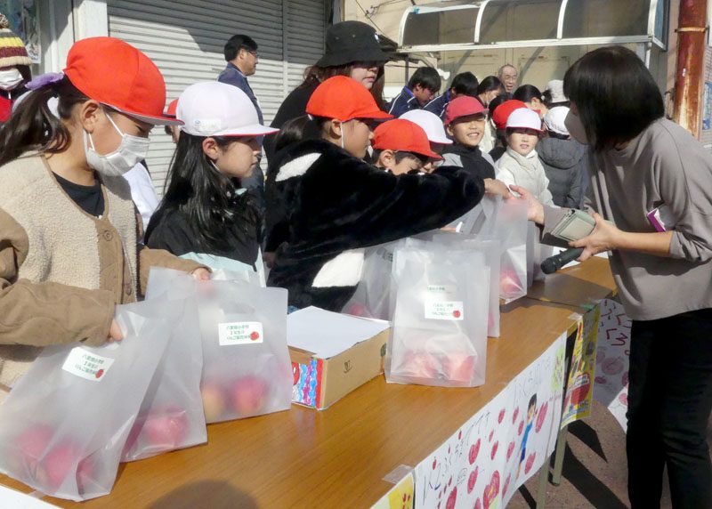 おいしく食べて 花巻・八重畑 児童がリンゴ販売