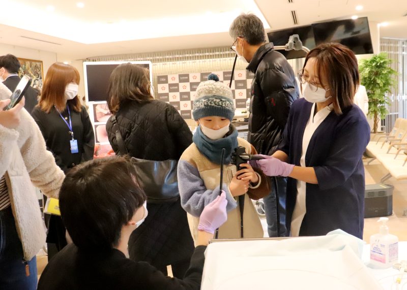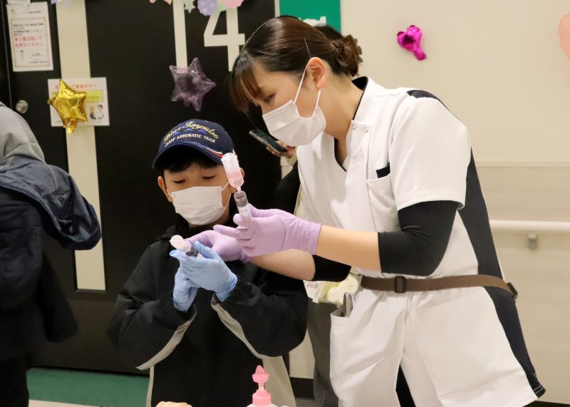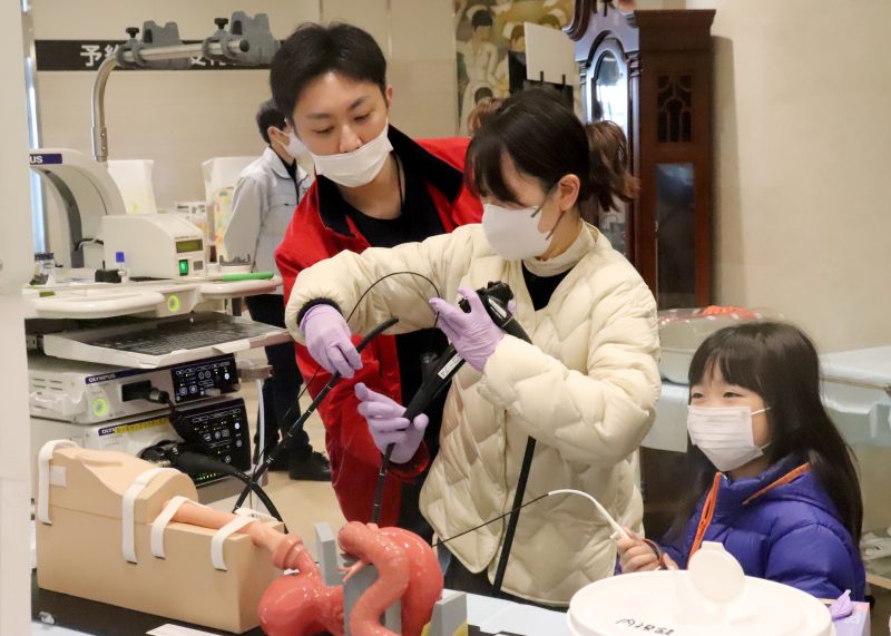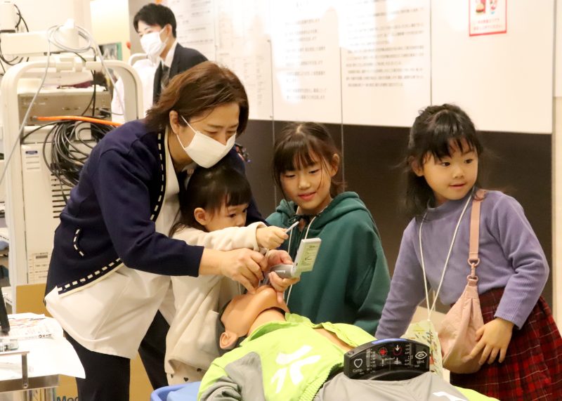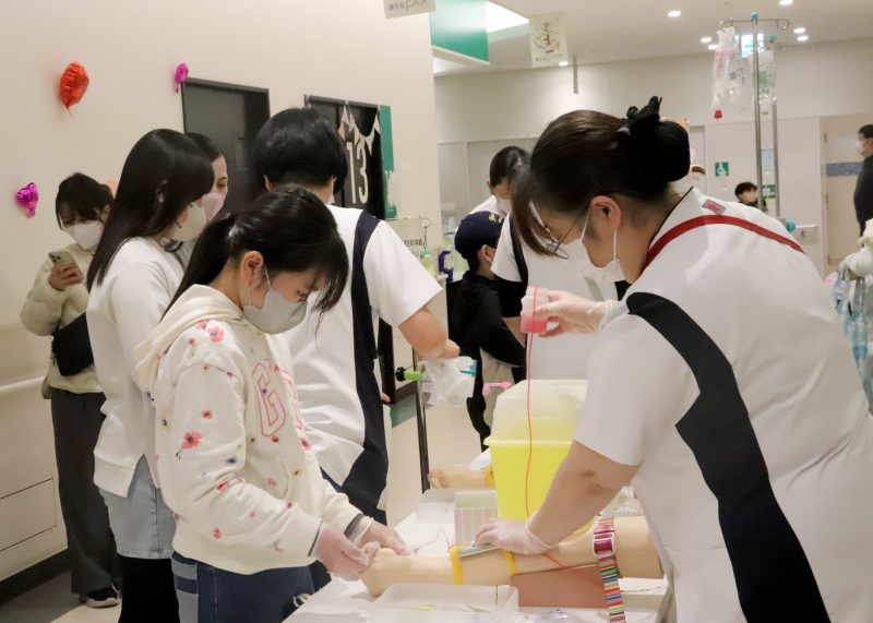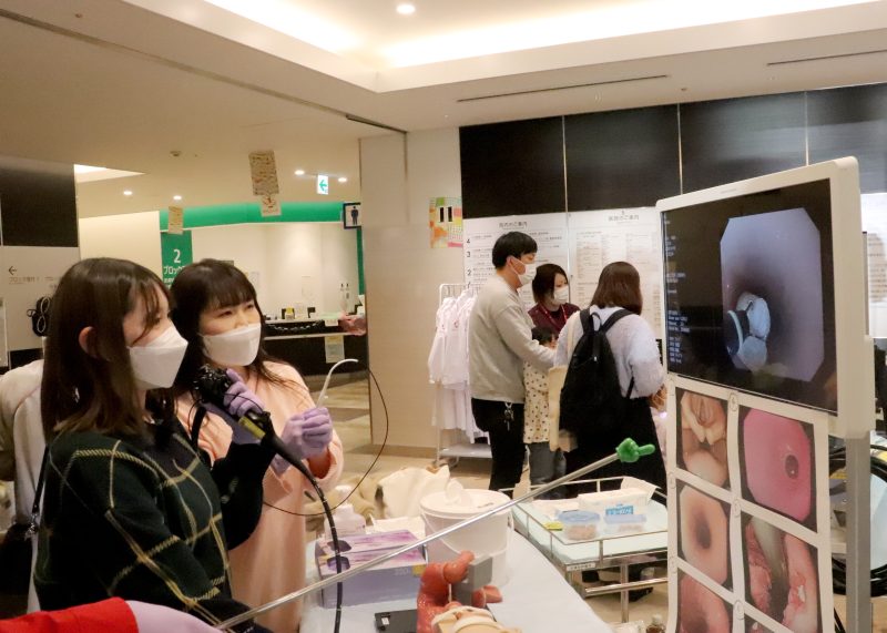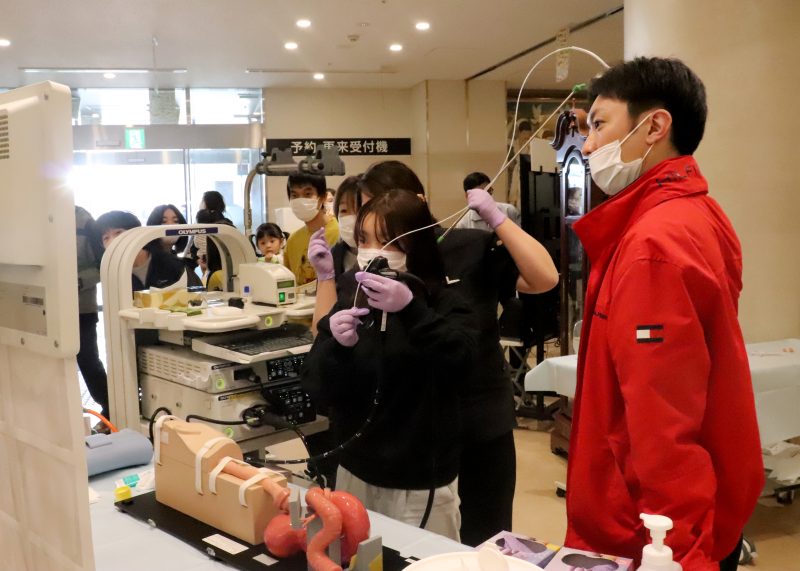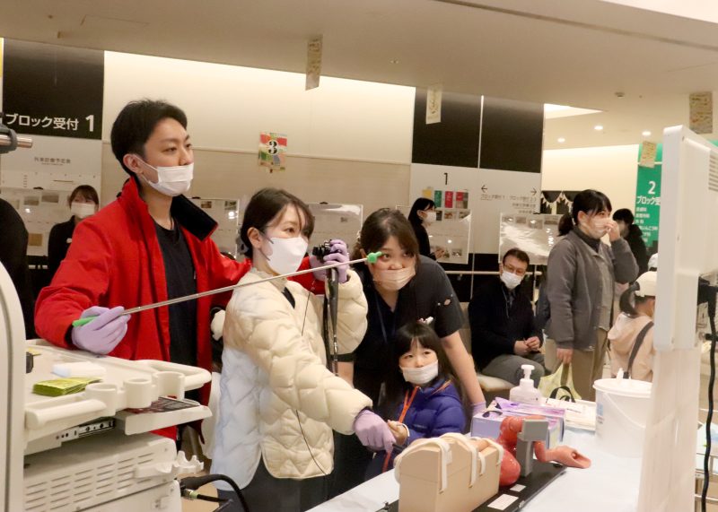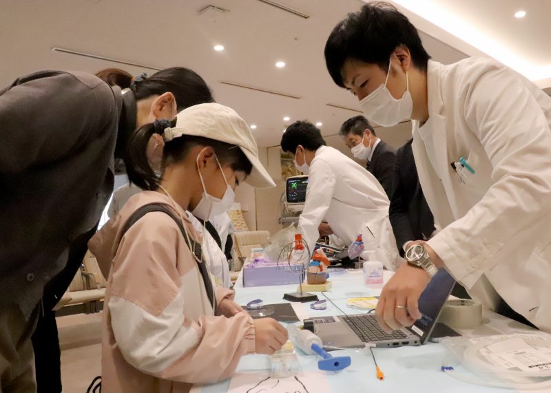 実際の院内機器を用いた胃カメラの操作や心臓カテーテルの挿入、ペースメーカーの埋め込み体験、薬剤師による調剤体験、看護師による点滴、採血体験など多彩なコーナーが並んだ。