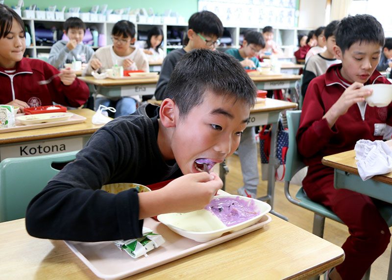 奥州市が児童生徒に姉妹都市の食材を使った給食を提供する「姉妹都市を味わう日」は、市内の小中学校で行われている。2025年度は北海道厚真町産の果実「ハスカップ」を使ったメニューで、児童生徒は「甘酸っぱくておいしい」などと話し、同町の名産品に理解を深めながら味わった。26日まで行われる。