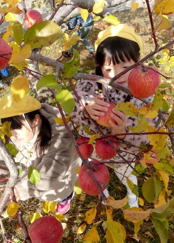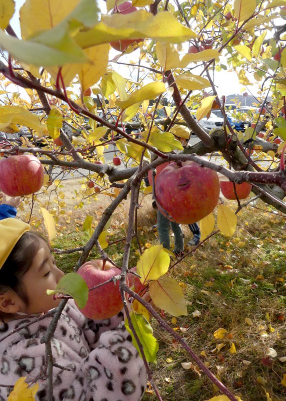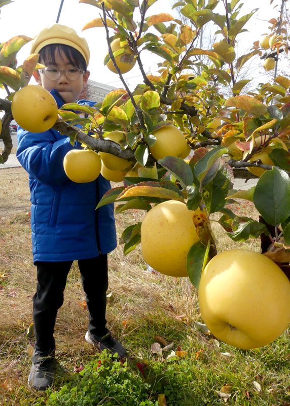 園児は「重かったけどいっぱい採った。黄色の方がおいしそうだった。リンゴは好きなので、みんなで食べたい」と語った。