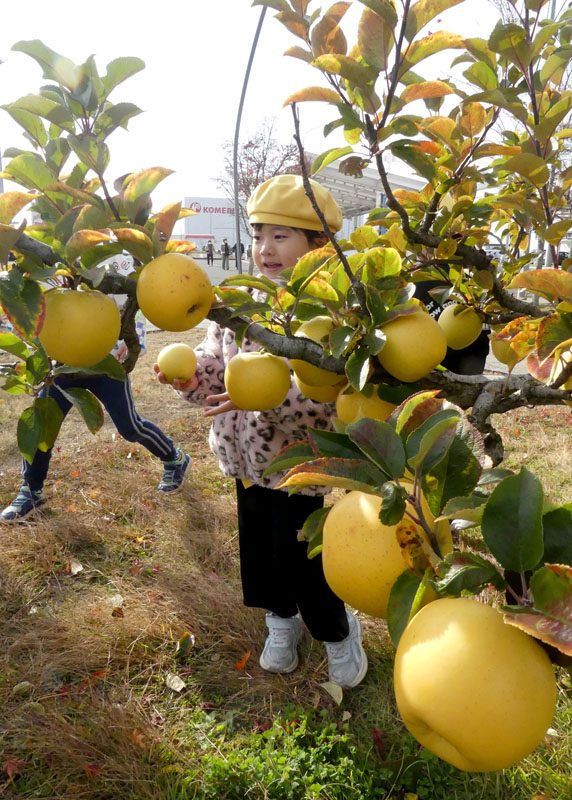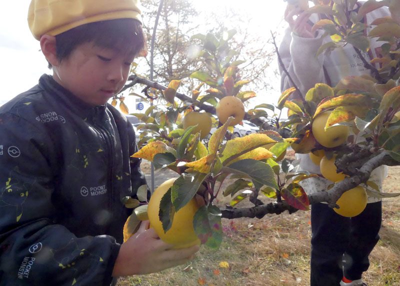黄色い実 おいしそう ユーミンのリンゴ 園児が収穫・花巻