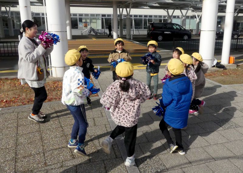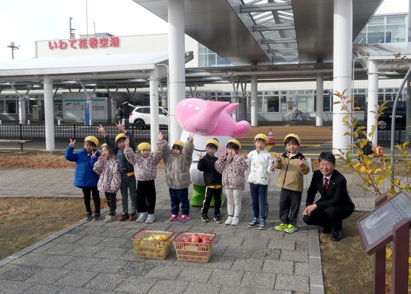 花巻市東宮野目のいわて花巻空港ターミナルビル正面に植えられた「ユーミンのりんごの樹」の収穫が18日、現地で行われ、花巻ささま幼稚園(多田恵園長、園児48人)の園児が色づいたリンゴを手に笑顔を見せた。