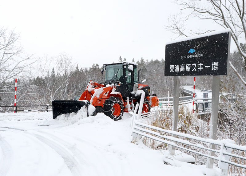 市や県、スキー場関係者ら約70人が出席。17日夕方ごろ降り始めた雪が、18日朝には30㌢ほど積もり、白銀のゲレンデを前にしての祈願祭となった。