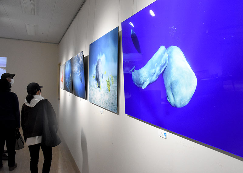 北上市在住の水中写真家・高橋怜子さんの作品展「Power~生きる力」は、同市北鬼柳の江釣子ショッピングセンターパルで開かれている。海洋生物の姿を捉えたダイナミックな写真が展示され、来場者を海の世界へといざなっている。24日まで。