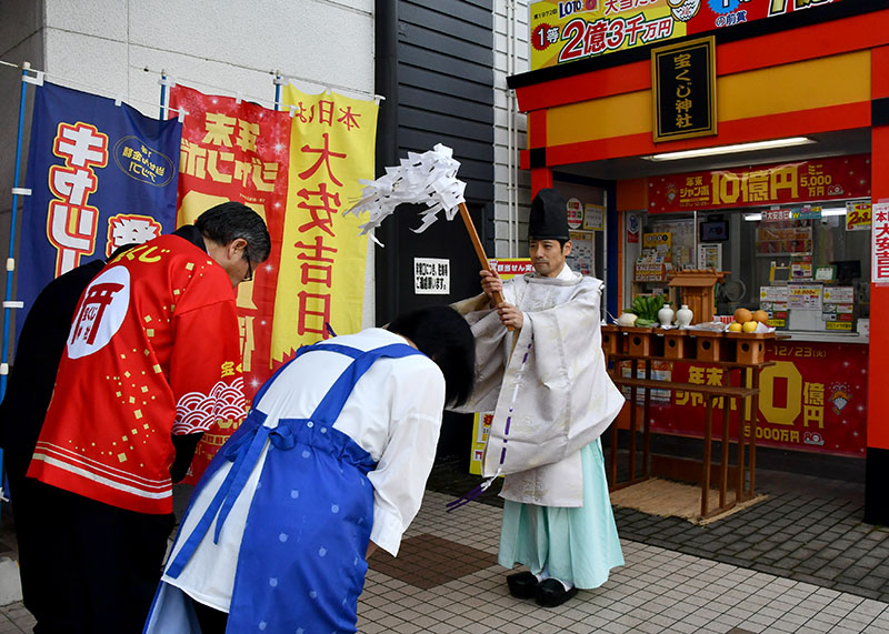 1等・前後賞合わせて最高10億円が当たる年末ジャンボ宝くじ(第1082回全国自治宝くじ)は21日、発売された。一関市山目の宝くじ神社イオン一関チャンスセンターでは販売に先立ち高額当せん祈願祭が行われ、大当たりを願って市民らが参列し、早速宝くじを買い求めた。販売は12月23日までで、同31日に抽せんが行われる。