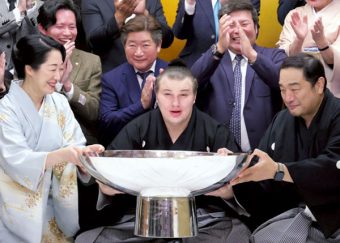 安青錦初Vに沸く 大相撲 夏合宿受け入れ 一関・東山後援会 垂れ幕掲げ祝福