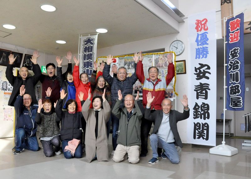 安青錦初Vに沸く 大相撲 夏合宿受け入れ 一関・東山後援会 垂れ幕掲げ祝福