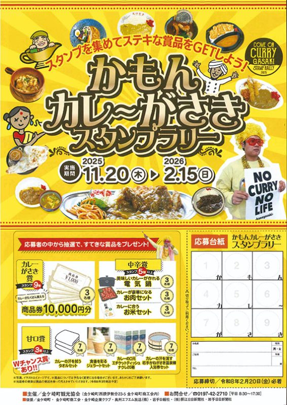 金ケ崎町観光協会(高杉郁也会長)主催の「かもんカレーがさきスタンプラリー」(岩手日日新聞社など後援)は、2026年2月15日まで町内16店で実施されている。各店自慢のカレーを味わいながらスタンプを集め、賞品が当たる抽選に応募できる。応募締め切りは同20日(必着)。