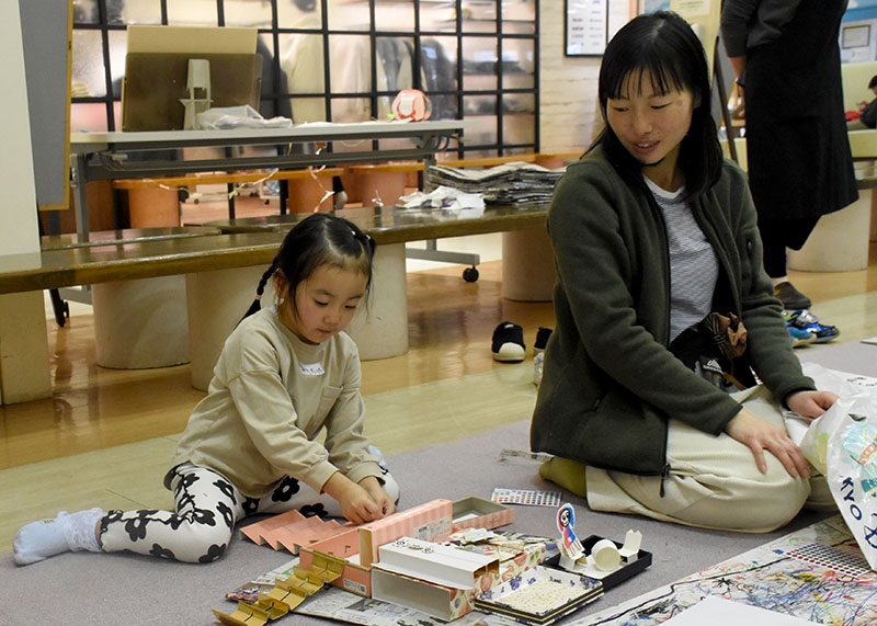 NPO法人芸術工房などが主催するあそび育て塾は29日、北上市北鬼柳の江釣子ショッピングセンターパルで開かれ、親子連れが厚紙や新聞紙を使って工作を満喫した。