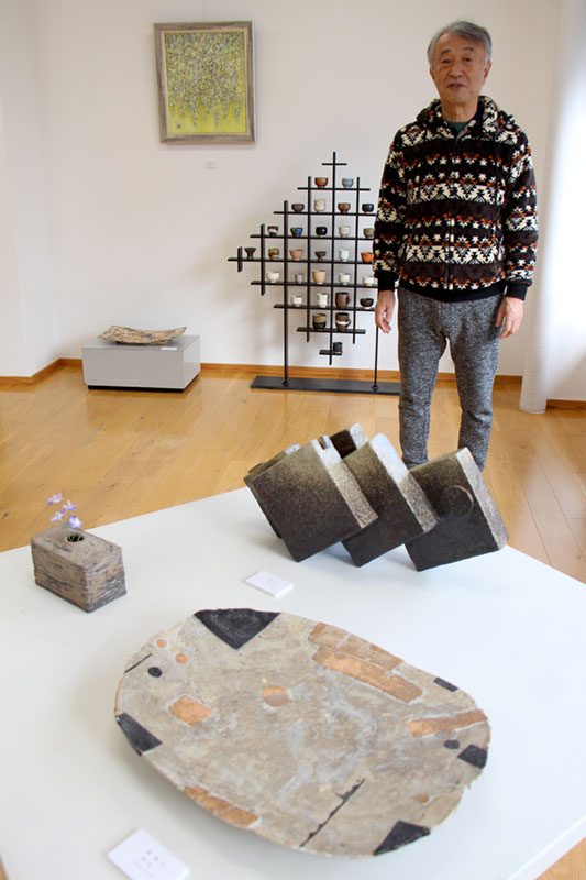 奥州市水沢真城の元美術教諭那須川重廣さん(72)の個展「絵画と陶芸」は、同市水沢横町のメイプル西館・水沢ガスショールームで開かれている。皿や茶わん、花瓶、オブジェなどの陶芸約170点と、油彩やアクリルの絵画14点を展示。那須川さんは「陶芸の制作と絵画の制作は、私の中で互いに影響し合っている。その面白さを感じてもらいたい」と来場を呼び掛けている。15日まで。