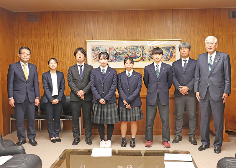 専大北上高校(阿部伸校長)の男女サッカー部と吹奏楽部は2日、北上市役所に八重樫浩文市長を表敬訪問し、全国大会での健闘を誓った。